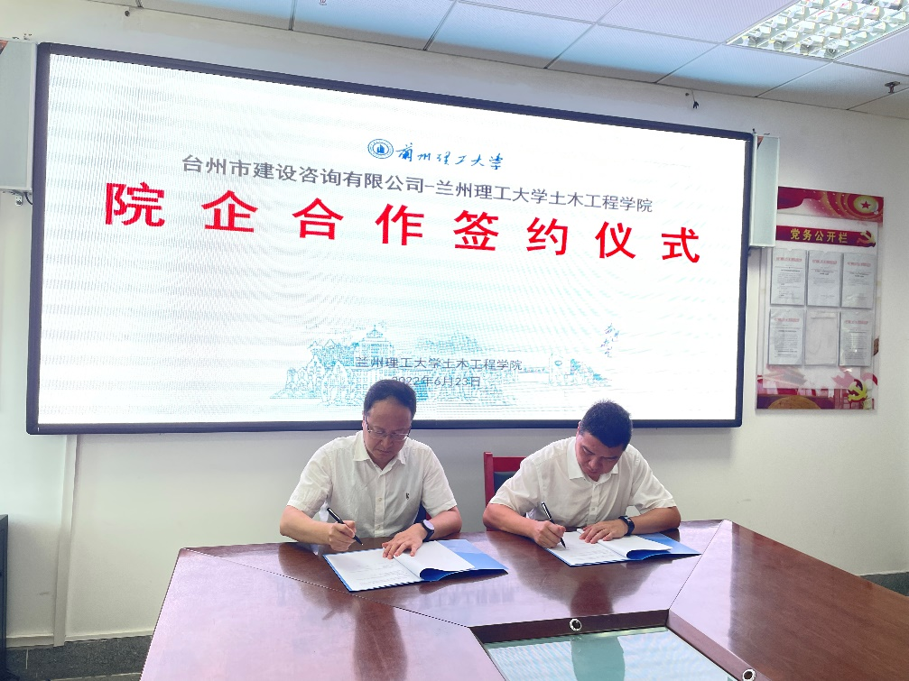 2022年6月23日,beat365在线官网入口与台州市建设咨询有限公司校企合作签约暨授牌仪式在土木公司会议室举行。台州市建设咨询有限公司总经理杨智勇,人力资源部经理张亚珍、副经理王涵竹,甘肃分公司总经理戴显义,beat365在线官网入口经理王文达教授、副经理殷占忠教授、李万润教授、建筑工程系主任吴长副教授、王永胜副教授,工程管理系主任刘平副教授出席了本次签约仪式。签约仪式由王文达主持。