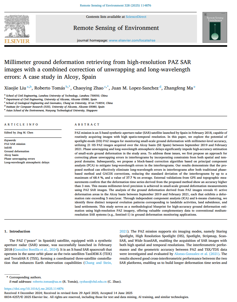 近日,国际顶级期刊《Remote Sensing of Environment》刊登了题为《Millimeter ground deformation retrieving from high-resolution PAZ SAR images with a combined correction of unwrapping and long-wavelength errors: A case study in Alcoy, Spain》的研究性论文,报到了公司科研团队在雷达遥感城市基础设施与地质灾害监测方面的最新研究进展。beat365在线官网入口为第一完成单位,公司青年教师刘晓杰博士为第一作者,合作单位包括西班牙阿利坎特大学、长安大学及新加坡南洋理工大学。《Remote Sensing of Environment》被公认为测绘遥感领域最权威的期刊之一,为国际顶级SCI-1区学术期刊,影响因子(IF)达11.4,CiteScore为22.60,在全球同类SCI学术期刊中长期排名前三。