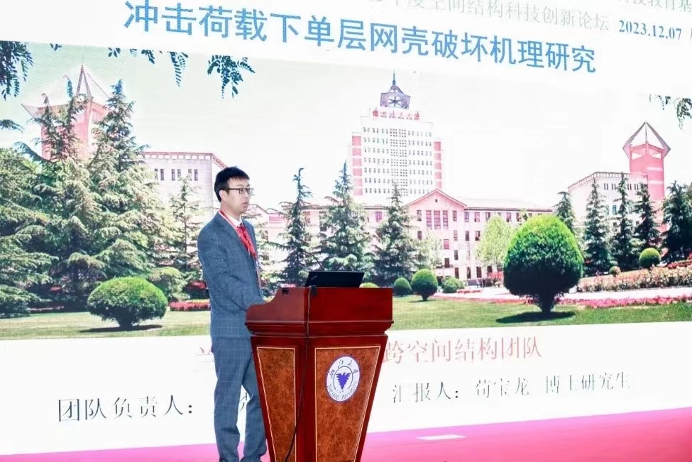 会上,王秀丽教授作了题为《西北空间结构应用研究与创新》的精彩报告,她结合自己多年来参与的我国西北地区大跨空间结构项目,深入浅出地介绍了西北恶劣环境对大跨空间结构带来的一系列亟待解决的问题。此外,在接下来的2023年度空间结构科技创新论坛学术沙龙环节,她结合西北实际情况及多年来在人才培养方面积累的经验,指出了西北地区大跨空间结构未来科技创新的发展方向并提出了西北地区空间结构领域高层次人才的培养机制。在下午的青年报告环节,苟宝龙博士作了题为《冲击荷载下单层网壳破坏机理研究》的学术报告。