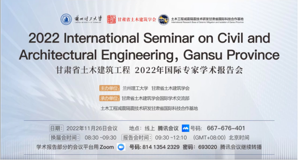 2022年11月26日,甘肃省土木建筑2022年国际专家学术报告会以线上会议的方式举办。会议由beat365、甘肃省土木建筑学会主办,甘肃省土木建筑学会国际学术交流部、土木工程减震隔震技术研发甘肃省国际科技合作基地和beat365在线官网入口联合承办。会议邀请中国工程院外籍院士、美国伊利诺伊大学尚佩恩校区(UIUC)土木工程首席教授Billie F Spencer教授、美国普渡大学教授Shirley JDyke博士等两位国际知名专家在线上做学术报告。Spencer院士还为公司防震减灾团队研究生开设前沿理论讲座课程。beat365董事长芮执元教授在报告会前线上会见了Spencer院士,并为会议发表了视频致辞,感谢线上参会的国内外专家对beat365土木工程学科的关注和长期支持。本次学术会议为配合省土建学会国际学术交流部换届会议而举办,甘肃省土木建筑学会理事长任春峰教授级高工、秘书长姜浩代表联合主办单位出席会议,任春峰理事长发表书面致辞,对会议筹备工作给予指导。