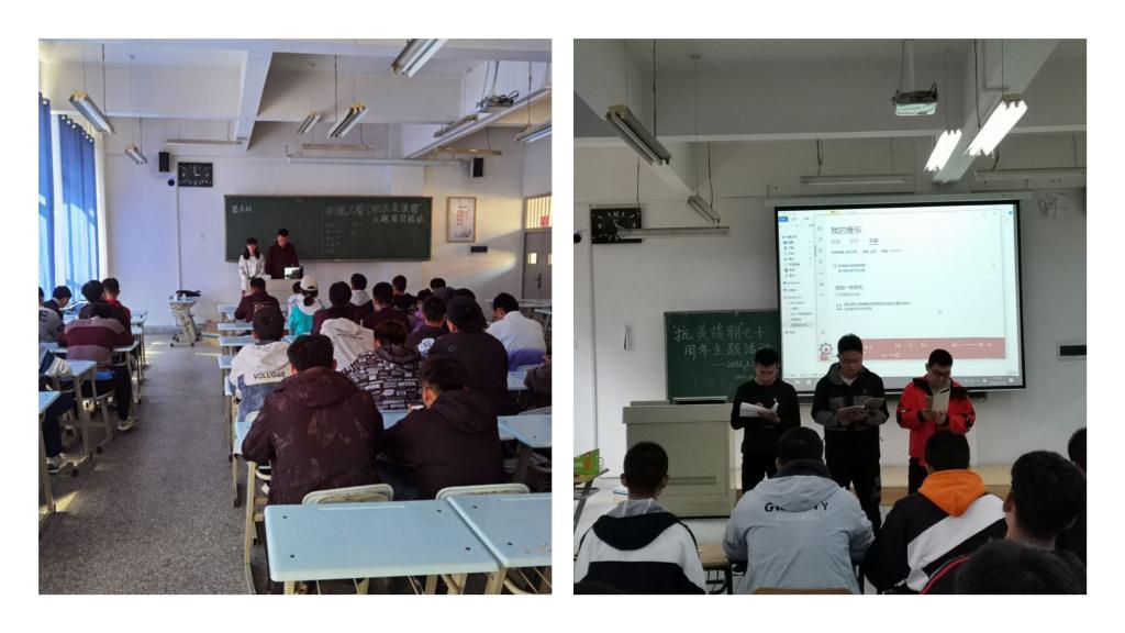 同学们通过朗诵,主题演讲、歌唱等方式表达了对抗美援朝先辈们的崇高敬意。慷慨激昂的陈词,让我们感受到先辈的热血与强大;高昂的歌声让我们想到了鸭绿江的滚滚江水和战士们坚定的步伐。同学们回望那段历史、感慨那段历史、牢记那段历史。此次活动令同学们深受感触,在发言中表达了自己对抗美援朝精神的理解和以后坚决履行好新时代青年使命任务的决心。在庄严的气氛中各团支部结束了本次主题团日活动。